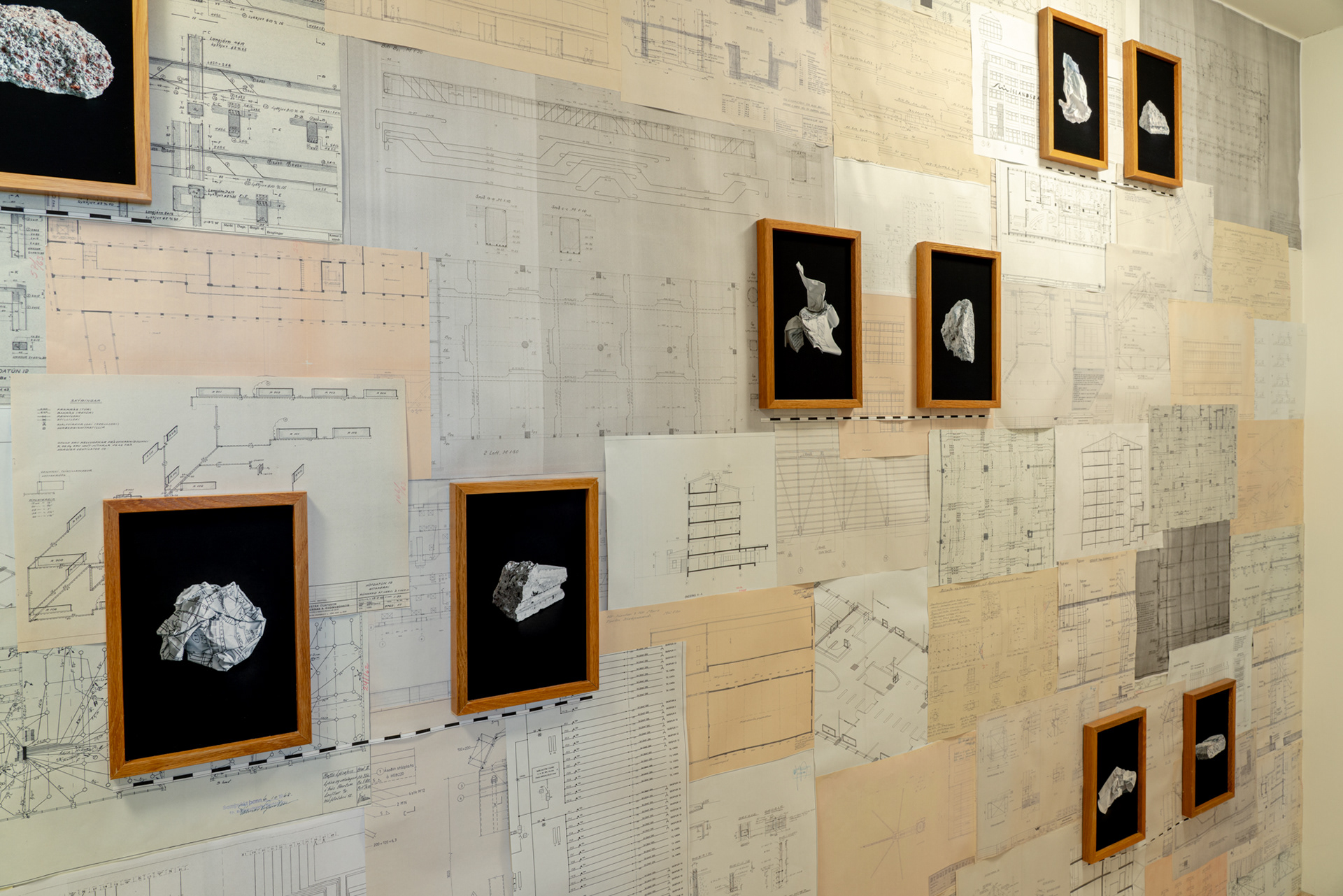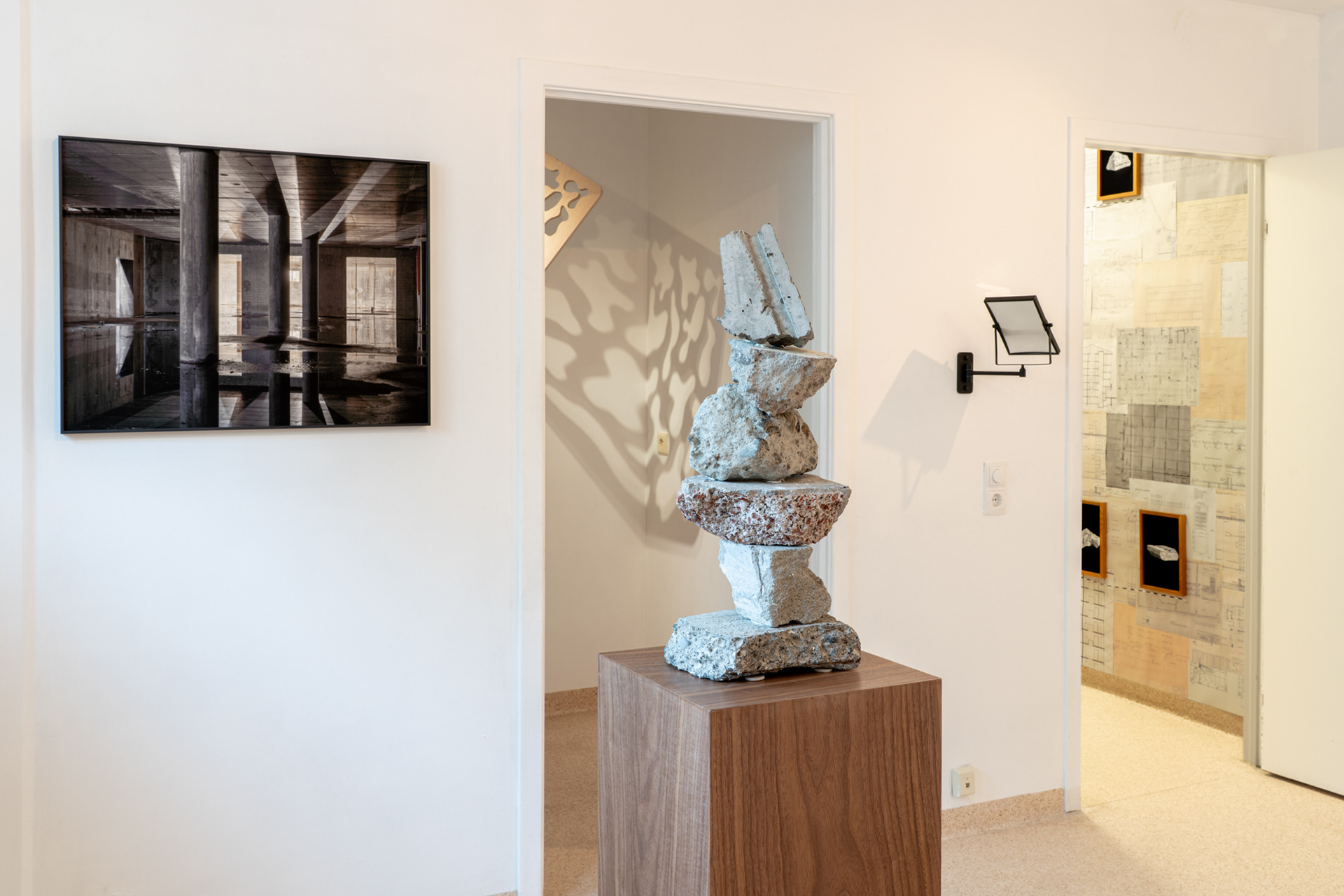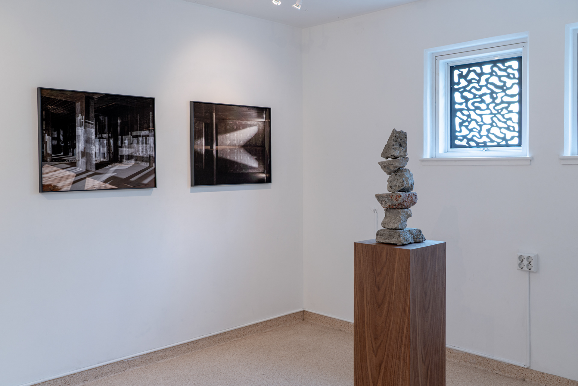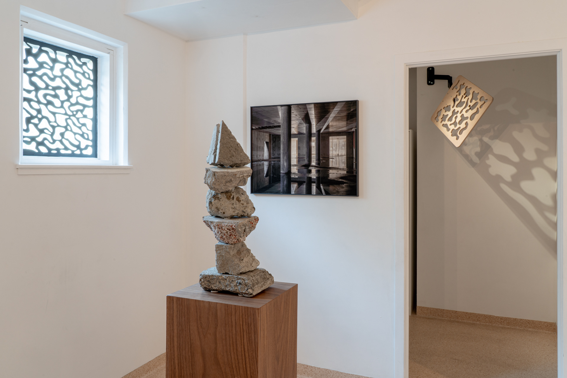 Helgi Vignir Bragason’s work take us through the beginning and end of a building’s life. Through photographs, sculpture and found imagery, he makes monuments of the acts of constructing and dismantling the temporality of the structures that shape our lives. In contrast, the sculptures of the artist duo Sid and Jim act as traps for missed daily ephemera; capturing light beams, or stabilizing doodles in steamed mirrors.